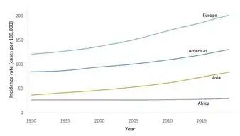 In North America, the rates of Alzheimer's disease in Asian Americans were found to be similar to Non-Hispanic whites and lower compared to Black Americans and Hispanic Americans.[6][9] Japanese Americans were found to have increased AD prevalence compared to other Asian American subgroups.[10] In terms of trends, Japan has experienced a rapid increase in prevalence rates relative to the global average, from 772 cases per 100,000 in 1990 to 3029 cases per 100,000 in 2019.[2] Japan is also expected to have the highest dementia-related death rates by 2040.[2]