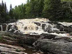 The Amédée river has a free weir-type dam to regulate the water flow.[6] The river ends with falls located near the site named Vieux Poste before emptying into the St. Lawrence River.