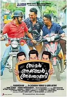 Amar Akbar Anthony is a 2015 Indian Malayalam-language comedy thriller film directed by Nadirshah and written by Bibin George and Vishnu Unnikrishnan. It stars Prithviraj Sukumaran, Jayasurya,Indrajith Sukumaran and Namitha Pramod. The music is composed by Nadirshah, while the background music is given by Bijibal. It was released on 16 October 2015.