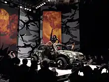 After pulling the original video, an edited video was premiered on April 16, 2003, on VH1, immediately after a special program called Madonna Speaks.[2] This version features Madonna singing in front of a backdrop of ever-changing flags of different countries and territories (including Greenland, Puerto Rico and Palestine).[45] In 2005, a director cut of the video leaked onto the Internet.[46] It shows heavier scenes, like wounded and maimed soldiers, war scenes, images of poverty and death.[46] In 2010, Slant Magazine placed this alternate video in the nineteenth place of the decade's fifty best music videos list, stating: "It isn't like either the video's message about viewing war as a form of popular entertainment or its striking, loaded images leave much room for misinterpretation. Prescient? Yes. Relevant? Surely. Subtle? Not so much."[47] This version of the video ends with the tossed grenade landing on the catwalk and Madonna putting her hands on her ears.[47]