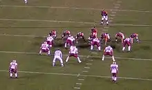 The offensive line (on left, in orange jerseys) consists of a center (with ball in hand ready to snap) with two guards on either side, and two tackles.