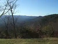 Amicalola Falls State Park & Lodge is an 829-acre (3.35 km2) Georgia state park located between Ellijay and Dahlonega in Dawsonville, Georgia. The park's name is derived from a Cherokee language word meaning "tumbling waters".[1] The park is home to Amicalola Falls, a 729-foot (222 m) waterfall that is the highest in Georgia.[2] However, an analysis conducted by the World Waterfall Data base suggests that the main part of the falls is 429 ft (131 m) in height, followed by a prolonged gently sloping run in which the flow drops another 279 ft (85 m).[3] It is considered to be one of the Seven Natural Wonders of Georgia. An 8-mile (13 km) trail that winds past Amicalola Falls and leads to Springer Mountain, famous as the southern terminus of the Appalachian Trail, begins in the park. Amicalola Falls State Park also offers many hiking trails, a guest lodge, restaurant, cabins, a shelter for long-distance Appalachian Trail hikers, a campground, and access to the eco-friendly Len Foote Hike Inn.
