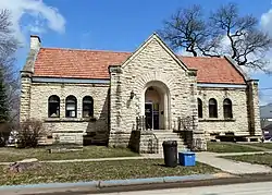 The public library had its beginnings in 1900 when former resident Walter S. Benton bequeathed $10,000 to buy library books if the city built a library building by 1903.[2] The city and the estate failed to reach an agreement, so the Francis Shaw Chapter of the Daughters of the American Revolution took over leadership of the effort and raised the necessary funds. Chicago architect Dwight H. Perkins designed the single-story Romanesque Revival-style building that was built of native limestone. The side-gabled structure featured a reading room on one side of the building and the book stacks on the other. A delivery desk was located in the center.[3]