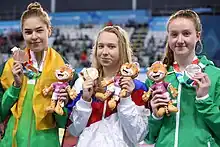 Day one of the 2018 Summer Youth Olympics in Buenos Aires, Argentina, at the Natatorium, Makarova swam the anchor leg of the 4×100 metre mixed freestyle relay in a time of 57.67, helping the relay qualify for the final ranked eighth, and won a gold medal in the event for her contribution in the prelims heats when the finals relay team, which did not include Makarova, finished first with a time of 3:28.50.[9][10] The same day, Makarova placed 14th in the semifinals of the 50 metre breaststroke and did not advance to the final of the event.[10] The next day, she split a 1:08.63 on the breaststroke leg of the 4×100 metre medley relay in the final to win the silver medal in a relay time of 4:06.07 with Daria Vaskina (backstroke), Polina Egorova (butterfly), and Elizaveta Klevanovich (freestyle).[11][12] In the final of the 100 metre breaststroke on day four, both Makarova and Niamh Coyne improved their final placement relative to the 2018 European Junior Championships, with Makarova winning the gold medal with a time of 1:07.88 and Niamh Coyne winning the silver medal in 1:08.90.[13][14]