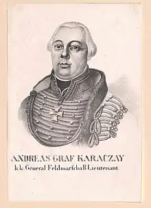 Andreas Karaczay de Vályeszáka[1] or Andreas Karaiczay de Wallje Szaka[2] or András Karacsaj de Válje-Szaka[3] (Croatian: Andrija Karadžić; Serbian: Андрија Караџић; 30 November 1744 – 22 March 1808) served in the Austrian army beginning in the Seven Years' War. In 1788–90, he fought in the Austro-Turkish War at Khotyn, Valea Seacă, Focșani, and Rymnik. In 1789 he was promoted to general officer, appointed Proprietor (Inhaber) of an Austrian cavalry regiment, and became a friend to the famous Russian General Alexander Suvorov. He fought in the French Revolutionary Wars until 1795 when he retired because of "war fatigue". Suvorov recalled him to action in 1799 when he fought at the Trebbia, Alessandria, and Novi. He led the Austrians at Second Novi. After being badly wounded at Stockach in 1800, he retired from his military offices in 1801.