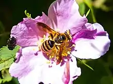 The golden-haired miner bee[1] (Andrena auricoma) is a species of miner bee in the family Andrenidae.[2][3][4] The female bees are 8 to 10 mm in length, and males are 6 to 9 mm long. It is found in the western United States, and is relatively rare outside California. It looks very similar to the death camas miner bee (Andrena astragali) but is smaller.[5]