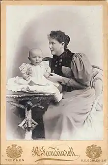On 3 June 1896 Grodyński married Alicja Matter,[9] the daughter of Alfons, a renowned builder, businessman and councillor in Cieszyn who was also a member of the Association of Silesian Catholics (pl)[10] and who also supported the opening of what was the first recognized "Polish School" in Cieszyn.[11] In 1897 Grodyński was appointed as a judge in Jabłonków where he moved with Alicja before relocating again in 1903 to take up the position of head of court in Strumień (where Oskar Zawisza became the local priest). In 1907 he transferred[12] to the District Court in Cieszyn, in which city he continued to reside (at 34 Bielitzerstrasse now Bielska street) even after his later appointment as President of the Court of Appeal in Katowice.