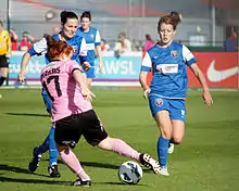 Ahead of the 2012 FA WSL season, James was signed by Mark Sampson for Bristol Academy.[11] She made her Bristol debut on 22 April 2014 as a 60th-minute substitute for Molly Clarke in a 1–0 home defeat to Lincoln Ladies.[12] On 26 May 2013, James appeared as a halftime substitute for Alex Windell during the 2013 FA Women's Cup Final. Bristol lost 3–0 to Arsenal.[13] James played in 13 of Bristol's 14 league games during the 2013 FA WSL season as the team earned their highest ever finish, runners-up behind Liverpool. The two met on the final day of the season separated by two points with Liverpool winning 2–0 to clinch the title.[14] During the 2015 FA WSL season, James played in all 14 games as the Vixens were relegated.[15] She left following the team's relegation having made 83 appearances in all competitions, scoring six goals. On her departure, Bristol manager Willie Kirk said, "You never want to lose top players, but following relegation it was inevitable that we would lose a few. Angharad played a big part in the club's successes over the past few seasons and at only 21 has bags of potential and can achieve a lot in the game... Angharad made her intentions to stay in WSL1 known to me very quickly so we have been planning for this for a while now."[16]
