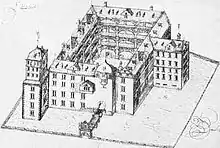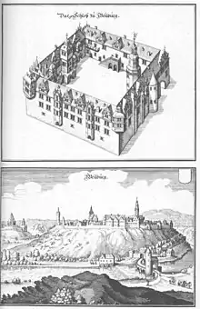 Dillenburg in 1575, showing the old castle at the top of the hill and the St. Johanniskirche below it