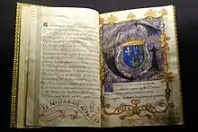 Miniature dedication of the Roman de Palamon et Arcita:[1] Anne de Graville presents her work to Queen Claude de France, Étienne Colaud, Bibliothèque de l'Arsenal, Ms.5116, f.1V.