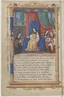 The translation was commissioned by Queen Claude and dedicated to her. Six manuscripts of this work survive today with the library shelf marks of Paris, bibliothèque de l'Arsenal, 5116; Paris, Bibliothèque nationale de France, français 1397 and 25441; Paris, Bibliothèque nationale de France n.a.f., 6513 and n.a.fr., 719 and Chantilly, Musée Condé, 1570. A modern edition and critical apparatus has been prepared and published by Yves Le Hir (PUF, 1965).[8]