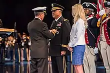 Admiral Harry B. Harris pins the Defense Distinguished Service Medal on Crutchfield's uniform at his retirement ceremony on April 7, 2017.