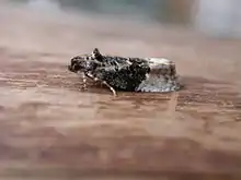 The wingspan is 16–20 mm. The forewings are white, sometimes partly ochreous - tinged, with some grey striae posteriorly. The basal patch and central fascia are dark brown, black -marked, the included space dark ashy-fuscous, all slightly whitish sprinkled, on fold sometimes more mixed with white. The posterior edge of fascia is nearly straight, followed in middle by a faint pinkish-ochreous tinge. Hindwings grey, darker posteriorly. The larva is green, incisions yellowish; dorsal and subdorsal lines grey-green; tubercular spots yellow; head yellow-green; plate of 2 pale green.[2] Julius von Kennel provides a full description.[3]