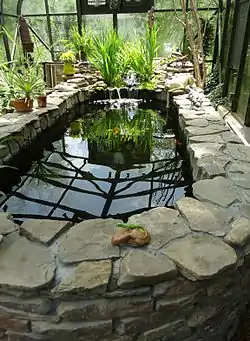 In the Victorian era in the United Kingdom, a common design for the home aquarium was a glass front with the other sides made of wood (made watertight with a pitch coating). The bottom would be made of slate and heated from below.[27] More advanced systems soon began to be introduced, along with tanks of glass in metal frames.[27] During the latter half of the 19th century, a variety of aquarium designs were explored, such as hanging the aquarium on a wall, mounting it as part of a window, or even combining it with a birdcage.[28]