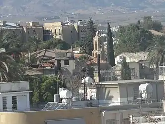 View of the neighbourhood of Arab Ahmet. Ledra Palace Hotel in background; Armenian Church (Karamanzade neighbourhood) in the foreground. Arab Ahmed Mosque located in wooded area right of the tower of that church.