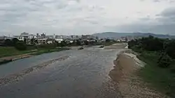 Looking southeast over the Arakawa River in Fukushima City. Fukushima Station is visible in the distance.