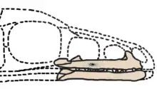 The snout of Archaeornithoides features a long antorbital fenestra, stretching over three quarters of the length of the maxilla. The maxilla bears at least eight teeth. These are small, conical and smooth, lacking wrinkles, serrations or carinae. The palatine bone seems to show the presence of a secondary fenestra.[3]
