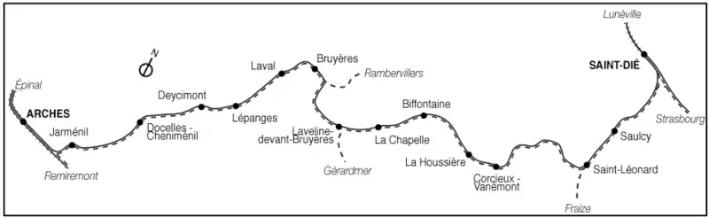 Route between Arches and Saint-Dié-des-Vosges that the railway takes.