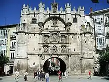 Arco de Santa María in Burgos, Spain, is to one of the twelve medieval gates the city had during the middle ages. It was rebuilt by Charles V, Holy Roman Emperor during the 16th century after the local rulers of the city supported him during the Revolt of the Comuneros. On the facade of the arch appear people of importance to the city of Burgos and Castile, such as Diego Rodríguez Porcelos, the founder of the city; Jueces de Castilla; Laín Calvo and Nuño Rasura; El Cid; Fernán González; and Charles V himself.[1]