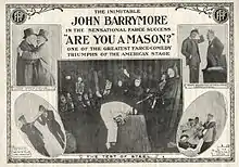 Are You a Mason? is a 1915 American silent comedy film produced by Adolph Zukor (Famous Players Film Company) and Charles Frohman, and distributed through Paramount Pictures. Directed by Thomas N. Heffron, it starred John Barrymore as a young husband who pretends to join the Masons as an excuse to get out of the house. It was based on a 1901 play by Leo Ditrichstein.[1]