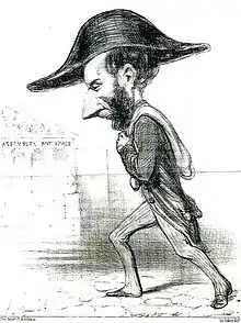 Caricature by Honoré Daumier, December 1848. The caption reads in part "Rigid guardian of the Republic, citizen Trouve-Chauvel is never separated from the treasure when he goes to the National Assembly. It is true that it is very easy to carry on his shoulder...".