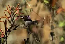 A Costa's Hummingbird feeding on a flower in the Hummingbird Aviary