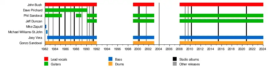 Armored Saint is an American heavy metal band formed in Los Angeles, California in 1982. Since 1990, the band has consisted of John Bush on lead vocals, Joey Vera on bass, Jeff Duncan on guitar and the Sandoval brothers (Gonzo and Phil) on drums and guitar, respectively. Of the current lineup, Bush and Vera are the two constant members. To date, the band has released eight studio albums, one EP, two live albums and one compilation album.