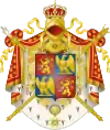 Quarterly, : I, Gules, a Horse forcene Argent (for Westphalia); II, grand quarter, 1. Gules, two Lions passant Or, 2. Or, a chief Sable, charged with a mullet of six points Argent (for Ziegenhain), 3. Or, a chief Sable, charged with two mullets of six points Argent (for Nidda), 4, Or, a Lion rampant guardant Gules, armed, langued and crowned Azure (for Katzenelnbogen), on an inescutcheon en surtout, Azure, a Lion rampant barry of Argent and Gules, crowned Or (for Hesse) ; III gyronny of Gules and Argent of six pieces, on an inescutcheon en surtout Or a Lion Gules ; IV, grand quarter, 1 Gules, two lions passant in pale Or (for Brunswick), 2 Or, a Lion rampant Gules, armed, langued and crowned Azure (for Diepholt), 3 Or, semy of hearts Gules, a Lion rampant Azure, armed and langued Gules (for Luneburg), 4 Gules, a Lion Or (for Lauterberg) ; en surtout, on an inescutcheon Azure, an Eagle Or, head pointing to the sinister, holding in its talons a thunderbolt Or (for Napoléon).