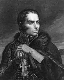 O'Connor was released in 1802 under the condition of "banishment".[20] He travelled to Paris, where he was regarded as the accredited representative of the United Irishmen by Napoleon. In February 1804, the future emperor appointed him General of Division for the Irish Legion being readied in Brittany for an invasion of Ireland.[21] According to the Nouvelle biographie générale (Paris, 1855)[22] the “openness of his character, and his unalterable attachment to the cause of liberty rendered him little agreeable to Napoleon" who, after abandoning plans for Ireland, did not again employ him.[3] On the other hand, it is the recollection of Paul Barras, who had been President of the French Directory, that it been by "compliance and boasting" that he had obtained from Napoleon, as emperor, all that the Directory had denied him.[23] In either case, as he had had no military experience, his appointment was resented by many of his compatriots in the Legion.[21]