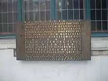 The memorial board from 1965 which commemorates the 20th anniversary of placing the Polish flag on the Artus Court by "soldiers of the Polish 1st Armoured Brigade of the defenders of Westerplatte fighting next to the troops of the Red Army's 2nd Belorussian Front under the command of Konstantin Rokossovsky as a symbol of liberation from Nazi occupation and reincorporation into the motherland of the ancient Polish city of Gdańsk".