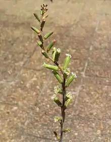 This species produces cream-white flowers in the rainy season (July to March depending on region), tinged with green or yellow. Like its eastern relative Astroloba congesta its flowers have unusually short pedicels. However Astroloba congesta has wider stems and concave upper faces to its leaves. Its close relative to the west, Astroloba robusta, has no pedicels at all and longer grey-brown leaves.[1][2]