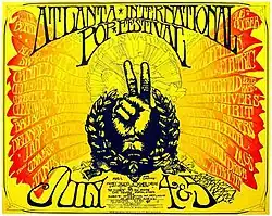 The second Atlanta International Pop Festival was a rock festival held in a soybean field adjacent to the Middle Georgia Raceway in Byron, Georgia, from July 3–5, 1970, although it did not finish until after dawn on the 6th.[6] It was the only successor to the first Atlanta Pop Festival, which had been held the previous summer near Hampton, Georgia. The event was promoted by Alex Cooley, who had helped organize the '69 Atlanta festival as well as the '69 Texas International Pop Festival, and two years later would promote the Mar Y Sol Pop Festival in Puerto Rico from April 1–3, 1972.