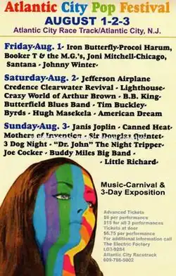 The Atlantic City Pop Festival took place in 1969 on August 1, 2 and 3rd at the Atlantic City race track, two weeks before Woodstock Festival. It actually took place in Hamilton Township at the Atlantic City Race Course.[1] There was heavy security at the festival,[2] and the stage the acts performed on was created by Buckminster Fuller.[3] A ticket for the entire 3-day weekend was $15.00 to see all of the performers listed. Attended by some 100,000+ people.