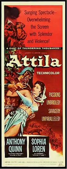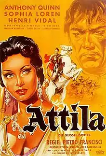 Attila (Italian: Attila, il flagello di Dio; French: Attila fléau de Dieu) is a 1954 Italian-French co-production, directed by Pietro Francisci and produced by Dino De Laurentiis and Carlo Ponti for Lux Film. Based on the life of Attila the Hun, it stars Anthony Quinn as Attila and Sophia Loren as Honoria, with French leading man, Henri Vidal, as the Hun's antagonist, Flavius Aetius. Irene Papas, in the second of three contract pictures for Lux Film, plays one of Attila's wives, Grune. Ettore Manni, Christian Marquand, and Claude Laydu are among the supporting cast of mostly French and Italian actors. American Scott Marlowe (1932–2001) made his screen debut in the film. Along with The Pride and the Passion and Houseboat, it was one of Loren's biggest box-office successes during the 1950s.