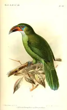 The groove-billed toucanet (Aulacorhynchus sulcatus) is a near-passerine bird in the toucan family Ramphastidae. It is found in Colombia and Venezuela.[2]