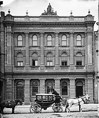 The foundation stone of this new head office was laid on 23 January 1877 by the AMP Society chairman, John Smith, with the main building construction tender undertaken by Hugh McMaster.[7] The new building of three storeys and a basement had a façade built in sandstone quarried from Pyrmont and ironwork supplied by Mort's Dock and Engineering Company.[8] The building was completed in 1878 and the first meeting of the AMP Society members in the new head office was held on 30 September 1879.[9]