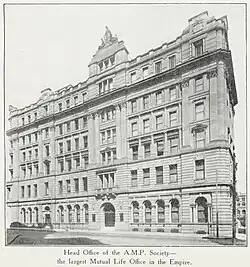 By 1909, the AMP Society found the current premises inadequate for its expanding business, and commissioned significant extensions to have six storeys above the street level and a full redesign of the existing premises on Pitt Street in a more restrained Free Classical style at a cost of £62,770.[10][11] The president of the NSW Institute of Architects, Ernest Alfred Scott of Scott & Green, was the architect, and Finlay Elgin Munro was the master builder.[10][12][13][14][15][16] The old 'Amicus' sculptural group by Charles Summers was determined to be too small in scale for the new offices and "fell to pieces" when it was removed, so the AMP Board commissioned a new 'Amicus' group sculpted by William Priestly MacIntosh to be placed atop the renewed headquarters.[17] The new offices were completed in late 1912, and were officially opened by the Governor of New South Wales, Lord Chelmsford, on 21 January 1913.[18]