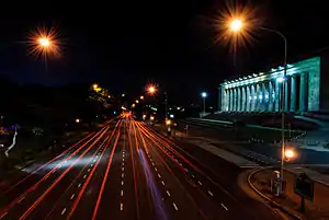 Chrysler Motors opened an assembly plant on the avenue in 1932 (since demolished), an investment complemented by a testing facility housed in an ornate structure north of Barrio Parque (the former facility today houses condominiums and an automobile museum).[3] The northern end of the avenue became home to the River Plate Football Club's monumental stadium, finished in 1938.[4] The avenue was later graced by tennis and country clubs, parks and a number of monumental public buildings, though its boulevard medians were removed around 1970 to accommodate growing traffic. Excavations along the avenue in 2008 uncovered remains of the former Hansen's Café, among the city's first and most popular tango redoubts until its demolition in 1912.[5]