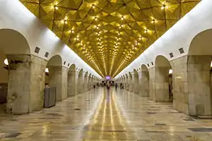 The station is built in a three-vault configuration 53 metres (173 feet) underground. The central hallway contains a sculpture made out of anodised gold pyramids and tetrahedra. The architects of the station are A.F. Strelkov, V.I. Klokov, N.I. Demchinsky, J.A. Kolesnikov, and E.S. Barsky. The theme of Aviamotornaya is aviation and flying. The columns holding up the ceiling are glazed in a light marble tone. The floor is made up of granite plates coloured in different shades of grey. The wall at the end of the central hallway is faced in a metal sculpture depicting Icarus. There are decorations mentioning and detailing the main constellations.[1]