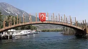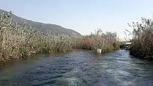It flows to Gulf of Gökova which is southernmost gulf of the Aegean Sea at 37°02′59″N 28°19′34″E / 37.04972°N 28.32611°E . It is a short creek. But its average flow rate is 700 liters (150 imp gal; 180 U.S. gal) per second which is higher than what is expected in a short creek.[1] The average depth of the creek is about 6 metres (20 ft). The creek is situated to the east of Akyaka a town known for its touristic potential. During summers there are regular excursion boat trips in the creek. Annually, the number of passengers is about a million [2] The fauna of the creek includes fresh water turtle and Eurasian otter.