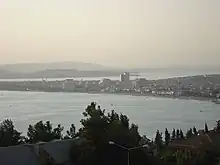 Büyükçekmece Dam on the Lake Büyükçekmece seen from the Büyükçekmece Bridge towards north.