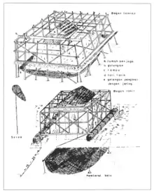 Bagan is made up of several components: Nets, shack (made of woven or wooden material, sometimes without roof), serok (handle net) and lights. The nets are generally 9 x 9 m wide, with 0.5 – 1 cm mesh, made of cotton or nylon yarn. These nets are fastened to a rectangular frame made of bamboo or wood. The shack (anjang-anjang) is made of bamboo/wood whose underside is 10 x 10 m, while the upper part is 9.5 x 9.5 m (for stationary bagan). At the deck there is a roller to lower and lift the net. Catching with a bagan is only done at night (light fishing), especially on the dark moon phase by using lights as fishing aids.[1]