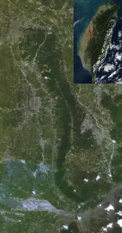 The Pakua Plateau or Bagua Plateau (Chinese: 八卦台地; pinyin: Bāguà Táidì), also known as the Pakua Mountain Range (八卦山脈), is a plateau located in central-western Taiwan. It stretches across Changhua County and Nantou County. The plateau borders the Changhua Plain in the west and the Taichung Basin in the east. It is long and narrow, with a length of about 32 km and a width of about 4 to 7 km. The highest peak of the plateau is Mt. Hengshan, which has a height of 424m.[1][2][3][4]