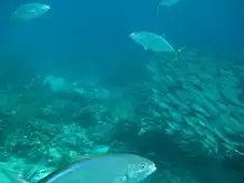 Fish that school in large numbers can draw the attentions of many different predator species. The attraction of huge numbers of prey fish means that these predator species, which might otherwise be mutually antagonistic, usually cooperate with each other in pursuit of their common goal.