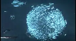 A bait ball, or baitball, occurs when small fish swarm in a tightly packed spherical formation about a common centre.[1] It is a last-ditch defensive measure adopted by small schooling fish when they are threatened by predators. Small schooling fish are eaten by many types of predators, and for this reason they are called bait fish or forage fish.