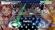 Girls Band Party!'s gameplay consists of tapping notes as they slide toward the bottom to the rhythm of a chosen song; such notes exist as taps, drag notes that players must hold, flick notes, and special yellow notes that activate character skills and lines mid-performance.[23] Players are given 1,000 health points to clear a song, but one can adjust song speed, difficulty level, and note size to their liking.[23][24] In lieu of a energy system that is prevalent in most free-to-play games, Girls Band Party! utilizes Live Boosts that increases rewards for completing a song, and players can continue playing even when they run out of boosts.[25]