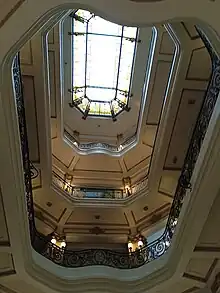 The floors where the bank operated are decorated with carved capitals, gilded ornaments and two-armed lamps. On the second floor, the capitals are straight, the slabs simple and the lights have a single arm. The first floor was marked by the rustic openings of the arches. The intermediate levels were organized in Ionic order and the roof featured a mansard. Due to its location, on the corner of the block, it was necessary to use an angled solution for the Baroque dome. One of the main architectural features is the solution of the central span of the interior with a double transparent light filter. The building's architecture is also characterized by a mixture of artistic influences. The Art Nouveau style is visible in the stained glass located at the top of the iron railings on the mezzanine and second floor, while Art Deco elements are evident in the chandeliers, the entrance hall and the wall lights.[14]