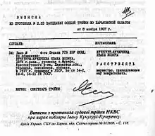 Document ordering the execution by shooting of blind kobzar I. Kuchuhura-Kucherenko in 1937.