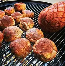 The bologna may be made of beef, pork, chicken, or any combination of those meats.[4] Sometimes the meat is seasoned before smoking.[5][6] Sweet spice rubs are preferred because of the natural saltiness and high nitrate content of the bologna.[2] Slices of smoked bologna are often grilled before consumption,[7][8] and then dressed in a tomato and mustard-based barbecue sauce.[1][9]