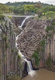 The canyon walls, called the Barranca de Santa María Regla, are lined by polygonal columns between 30 and 50 metres (98 and 164 ft) high, with five or six sides each.[3] The basalt columns were created by the slow cooling of volcanic lava. The visible columns are backed by even more polygonal basalt columns. There are two waterfalls. The higher one has its water supplemented by diversions from nearby dams.[3] The lower one is called the Cascada de la Rosa.[3][4] The natural canyon has been modified by the addition of stairs, walkways and hanging bridges for easier access.[4]